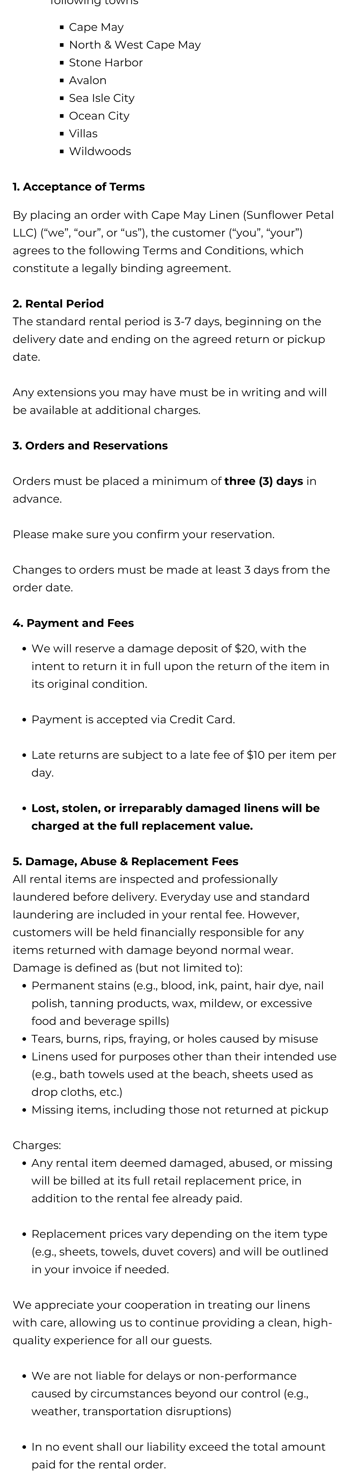 By completing your order with Cape May Linen Rentals, you agree to our Rental Terms & Conditions. Please review details on rental periods, cancellations, returns, and your responsibilities during the rental.